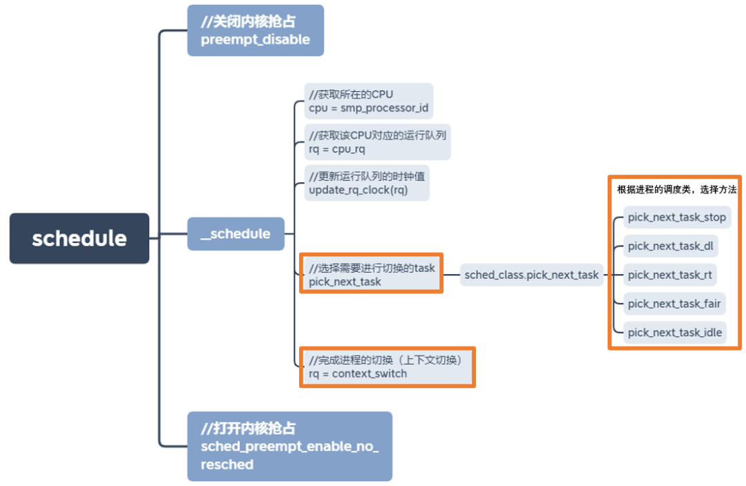 重点是其中的两个函数,一个是选择需要切换任务的 pick_next_task,另外一个是完成进程上下文切换 context_switch。