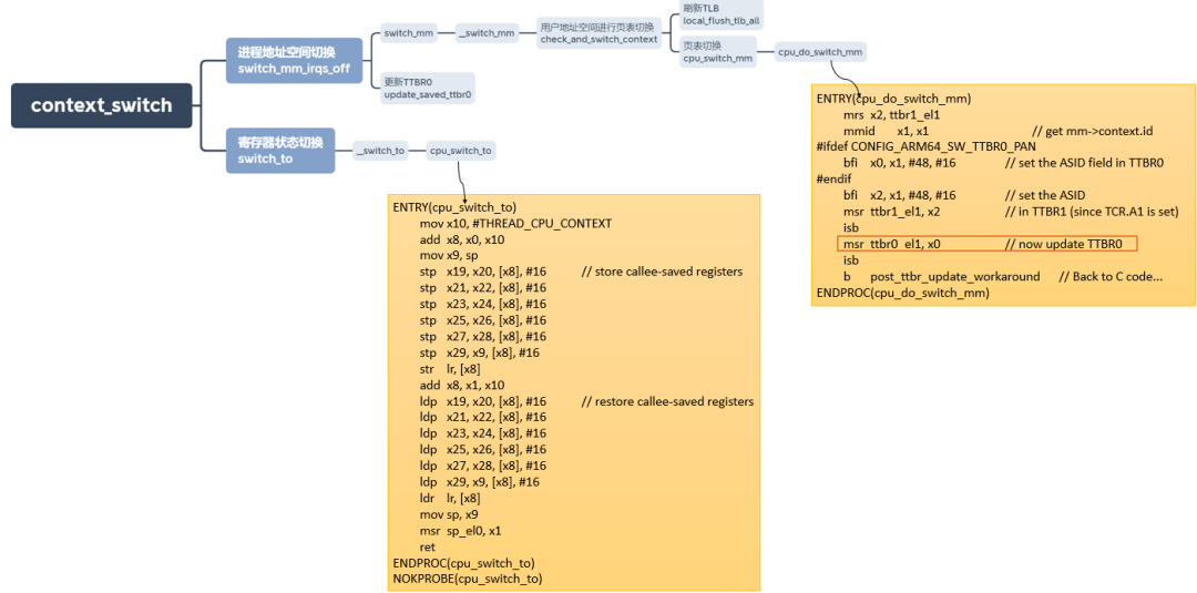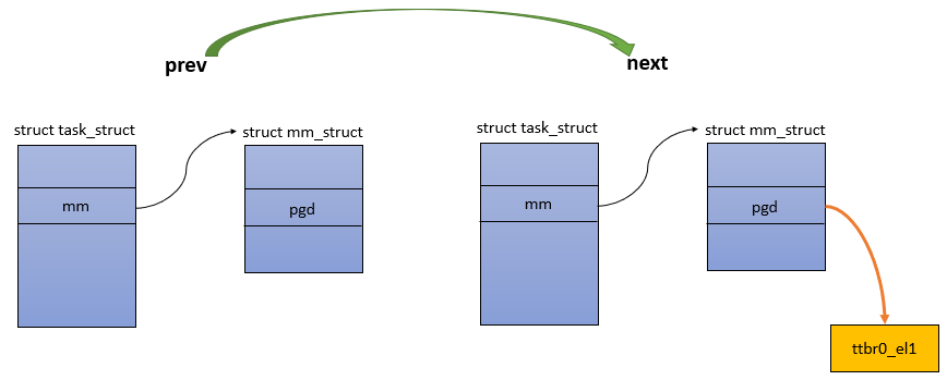 将下一个进程的pgd虚拟地址转化为物理地址存放在ttbr0_el1中(这是用户空间的页表基址寄存器),当访问用户空间地址的时候mmu会通过这个寄存器来做遍历页表获得物理地址。完成了这一步,也就完成了进程的地址空间切换,确切的说是进程的虚拟地址空间切换。