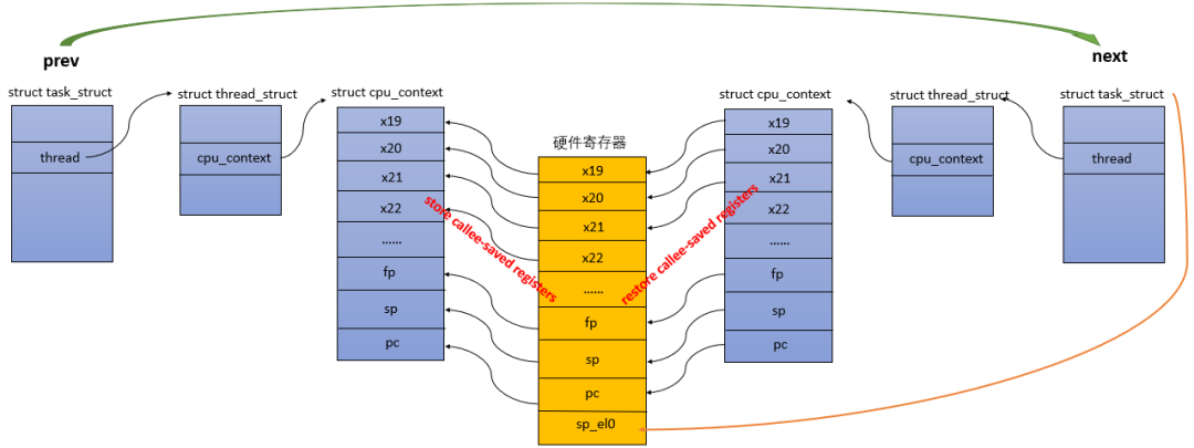 其中x19-x28是arm64 架构规定需要调用保存的寄存器,可以看到处理器状态切换的时候将前一个进程(prev)的x19-x28,fp,sp,pc保存到了进程描述符的cpu_contex中,然后将即将执行的进程(next)描述符的cpu_contex的x19-x28,fp,sp,pc恢复到相应寄存器中,而且将next进程的进程描述符task_struct地址存放在sp_el0中,用于通过current找到当前进程,这样就完成了处理器的状态切换。
