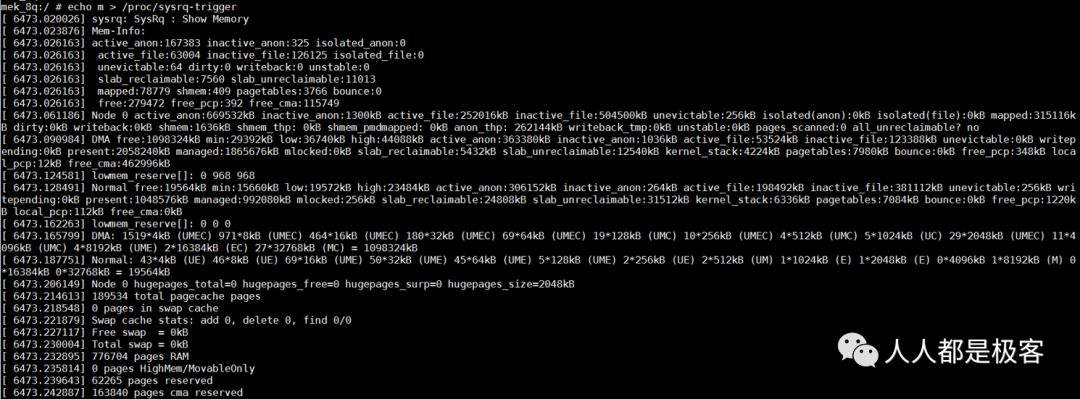 也可以通过echo m > proc/sysrq-trigger来观察buddy状态,与/proc/buddyinfo的信息是一致的: