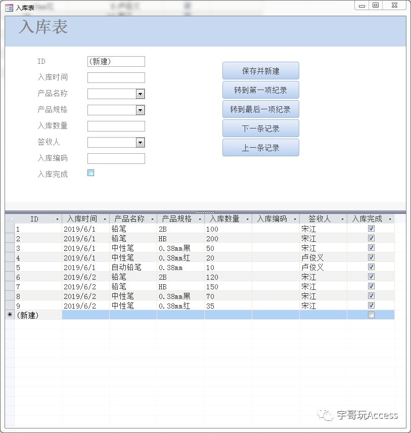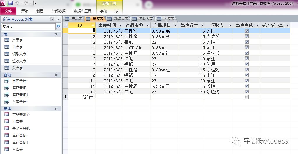 经过设计和优化,一共形成两张核心表:入库表和出库表,三张非核心表:产品表、领取人表、签收人表。