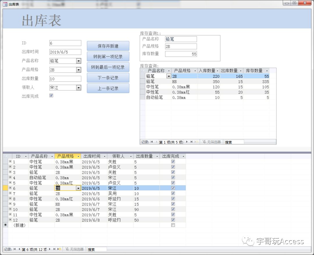 本数据库中最重要也是最常用的设计界面,其实是这张出库表,技术最难点在于如何实时显示某一种办公用品的库存量。只有实时显示库存量才能让发放管理更加清晰,还能实时显示较低库存的用品,提醒及时购入。