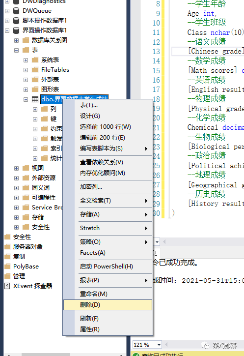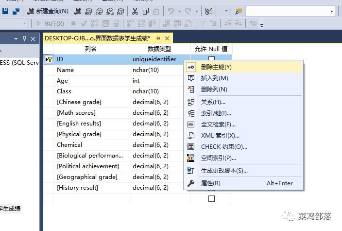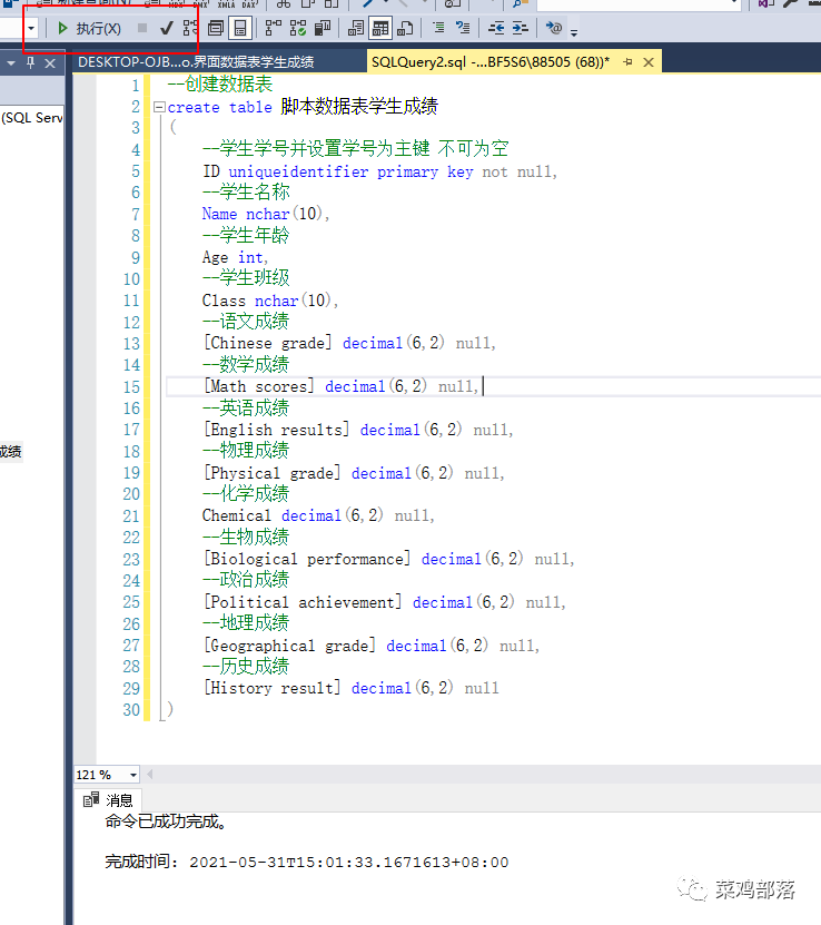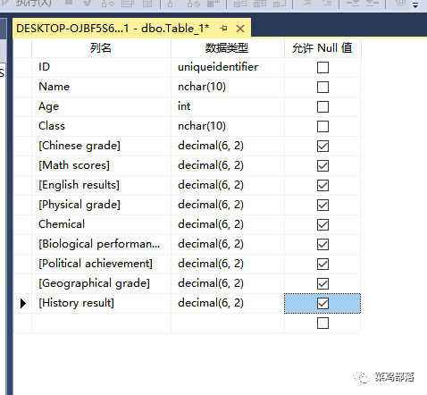 --创建数据表create table 脚本数据表学生成绩(--学生学号并设置学号为主键 不可为空 默认为空ID uniqueidentifier primary key not null,--学生名称Name nchar(10),--学生年龄Age int,--学生班级Class nchar(10),--语文成绩[Chinese grade] decimal(6,2) null,--数学成绩[Math scores] decimal(6,2) null,--英语成绩[English results] decimal(6,2) null,--物理成绩[Physical grade] decimal(6,2) null,--化学成绩Chemical decimal(6,2) null,--生物成绩[Biological performance] decimal(6,2) null,--政治成绩[Political achievement] decimal(6,2) null,--地理成绩[Geographical grade] decimal(6,2) null,--历史成绩[History result] decimal(6,2) null)