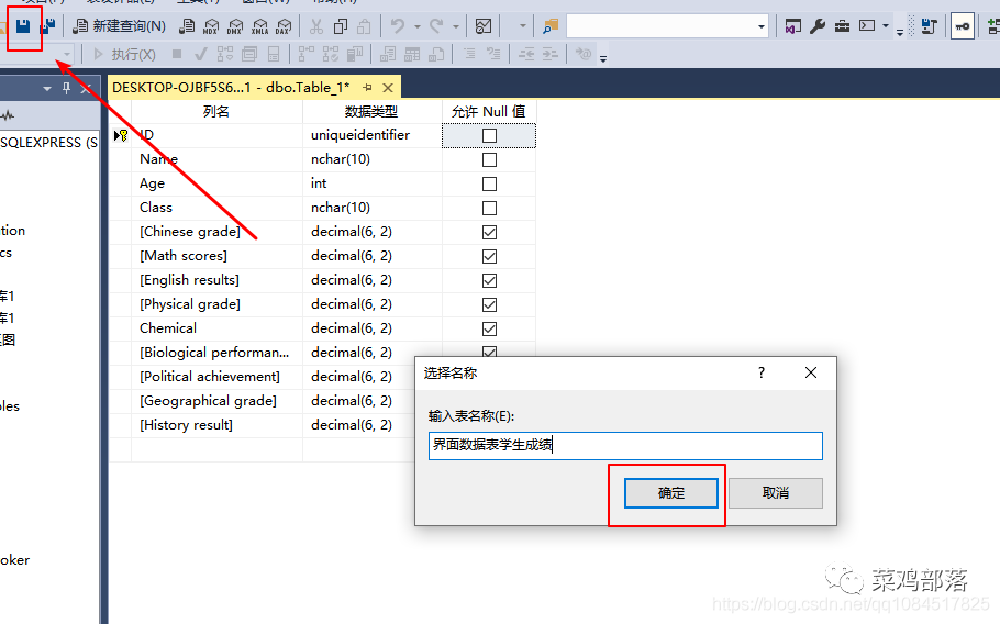 在对象资源管理器中选择要创建表的数据库,右键单击新建然后单击表->打开表创建,按照之前的表格的表头写入每个表头并为其选择数据类型.->设置学号为唯一的主键,单击保存->打开选择名称,输入需要保存的数据表的名称->单击确认->保存完成