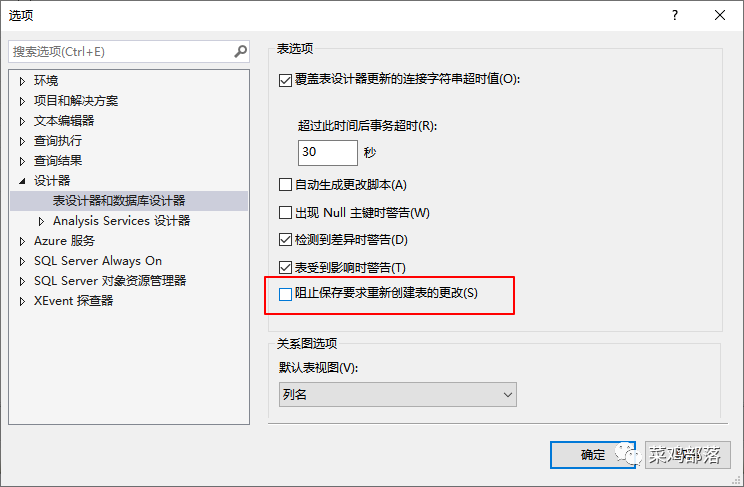 处理办法:右键单击工具选择选项->打开选项单击设计器,将阻止保存要求重新创建 表的更改设置为未勾选即可->重新点击保存就可以了