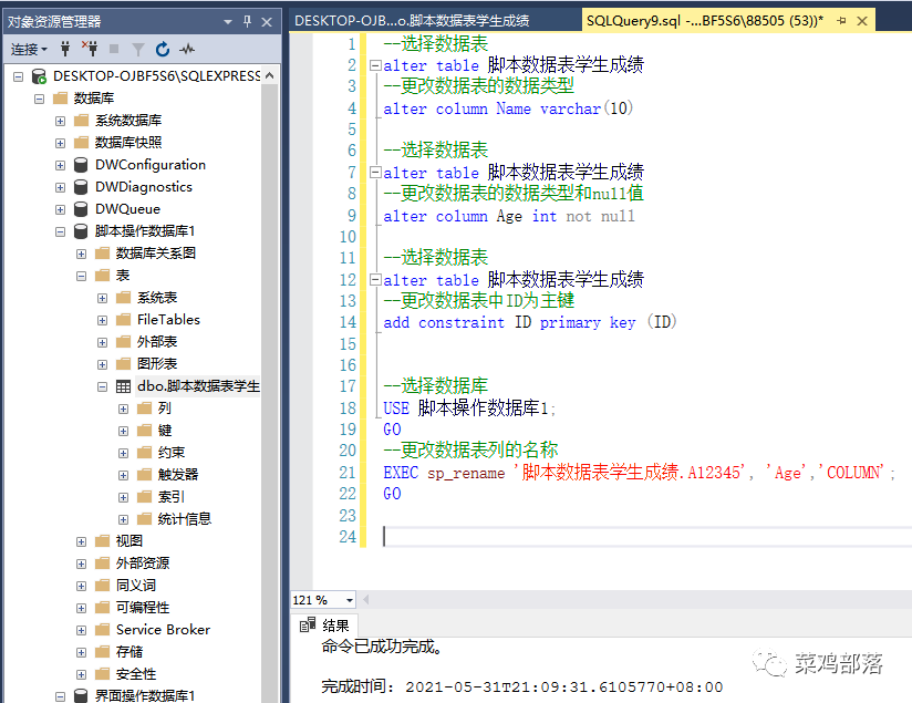 --选择数据表alter table 脚本数据表学生成绩--更改数据表的数据类型alter column Name varchar(10)--选择数据表alter table 脚本数据表学生成绩--更改数据表的数据类型和null值alter column Age int not null--选择数据表alter table 脚本数据表学生成绩--更改数据库的ID为主键add constraint ID primary key (ID)--选择数据库USE 脚本操作数据库1;GO--更改数据表的列的名称EXEC sp_rename '脚本数据表学生成绩.A12345', 'Age', 'COLUMN';GO