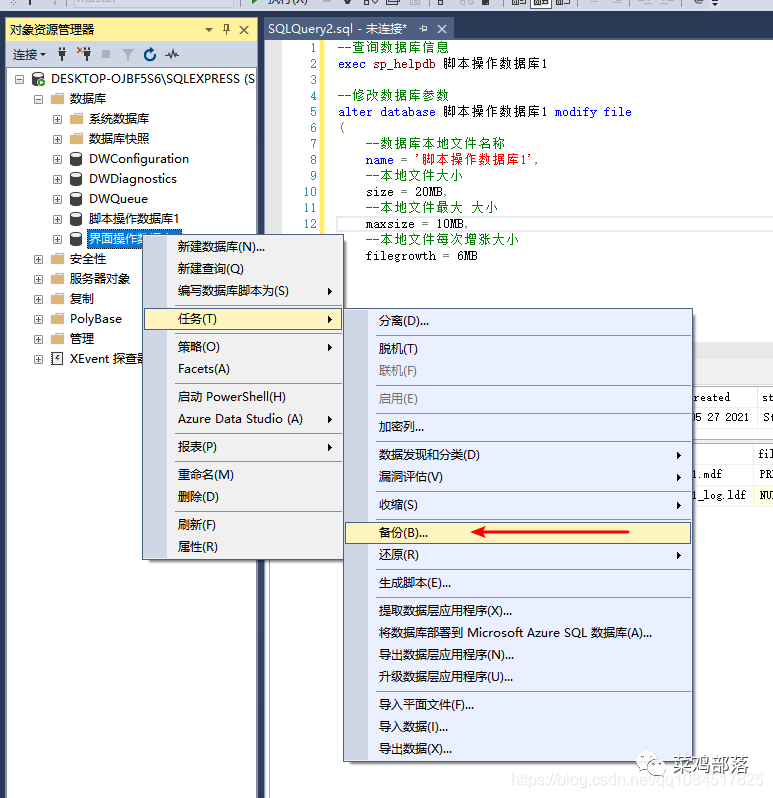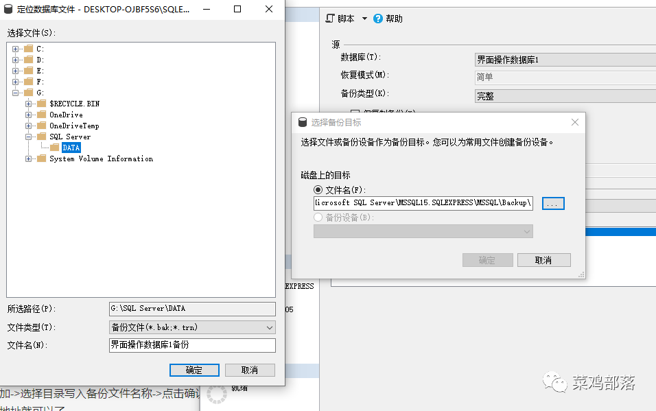 选择数据库->右键选择的数据库,点击任务然后点击备份->进入备份数据库页面,点击添加->进入选择备份目录,点击...->进入定位数据库文件页面,选择备份数据库文件的位置,输入文件名称,点击确认->返回选择备份目标页面点击确认->返回备份数据库页面删除原来不用的地址或选择新的地址,点击确认->备份完成