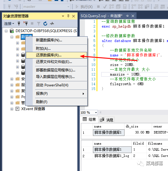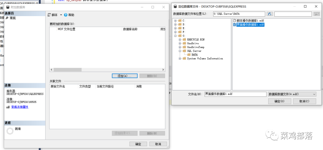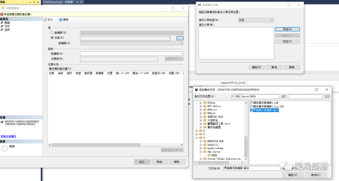 按照自学教程第二章删除数据库后->右键选择数据库,点击还原数据库->打开还原数据库页面,选择设备,点击...->打开选择备份设备,点击添加->打开定位备份文件页面,选择所以文件,点击选择的文件,点击确认->返回选择备份页面,点击选择的文件点击确认->返回还原数据库点击确认->数据库还原完成