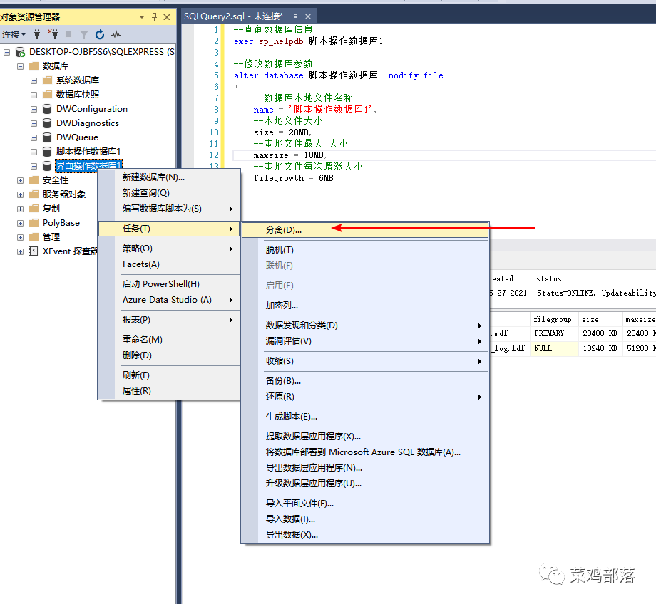 选择需要分离的数据库,,右键点击任务然后点击分离->打开分离数据库页面点击确认->数据库分离完成