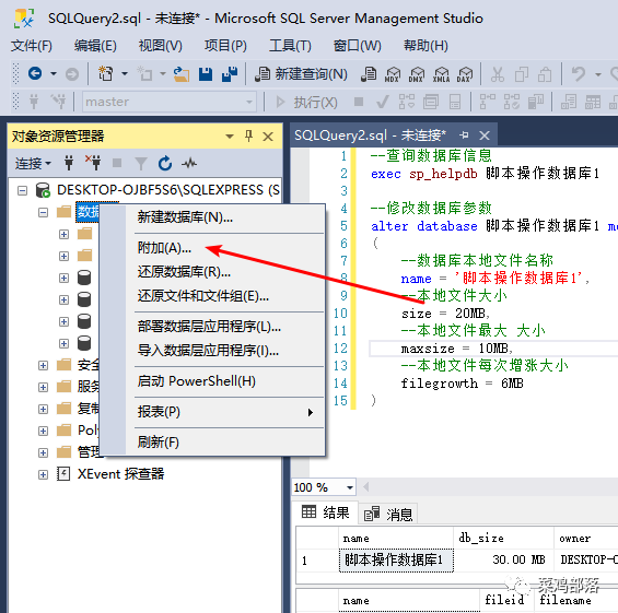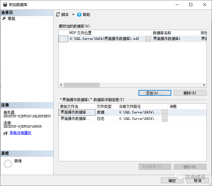 右键数据库点击附加->打开附加数据库页面点击添加->打开定位数据库文件页面选择需要附加的数据库文件,点击确认->返回附加数据库页面点击确认->附加数据库完成