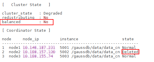 - 执行gs_om -t status --detail重新查看集群状态。此时故障服务器上整个集群的balanced状态为“No”;CN状态应该为Deleted;原始为主的DN,其状态应该为“Standby Normal”。