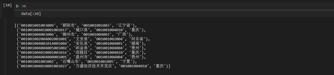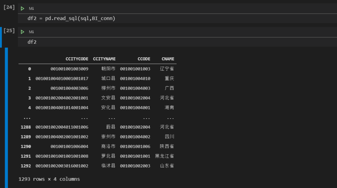 pandas.read_sql(sql, # 要执行的sqlcon, # 数据库连接对象index_col='None', # 索引列coerce_float='True', # 是否将非字符串、非数字对象(如decimal.Decimal)的值转换为浮点值,这对SQL结果集很有用。params='None',parse_dates='None', # 要解析为date类型的数据列columns='None', # 列名称chunksize: None = 'None') # 执行SQL查询生成DataFrame,如果chunksize不为None,# 则生成可迭代的DataFrame对象,每个DataFrame块包含chunksize设置的行数的数据。# 也就是通过chunksize将SQL执行后的数据分成几块。df2 = pd.read_sql(sql,BI_conn)