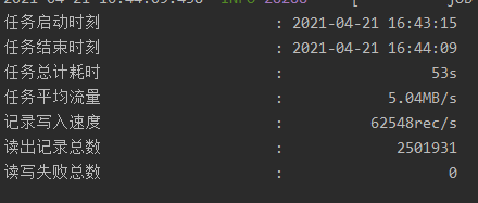 reader_parameter['connection'][0]['jdbcUrl'] = [reader_dbinfo.loc[0,'DB_JDBC']]reader_parameter['username'] = reader_dbinfo.loc[0,'DB_UNAME']reader_parameter['password'] = reader_dbinfo.loc[0,'DB_PWD']reader_parameter['connection'][0]['table'] = [reader_table]reader_parameter['column'] = columns# 如果没有给出splitpk,那么我们默认获取表的第一个字段作为splitpkif len(splitPk) > 0:reader_parameter['splitPk'] = splitPkelse:reader_parameter['splitPk'] = columns[0]writer_parameter['connection'][0]['jdbcUrl'] = writer_dbinfo.loc[0,'DB_JDBC']writer_parameter['username'] = writer_dbinfo.loc[0,'DB_UNAME']writer_parameter['password'] = writer_dbinfo.loc[0,'DB_PWD']writer_parameter['connection'][0]['table'] = [writer_table]writer_parameter['column'] = columnsread_df.to_json(f'{json_file}') # 将json写入模板文件