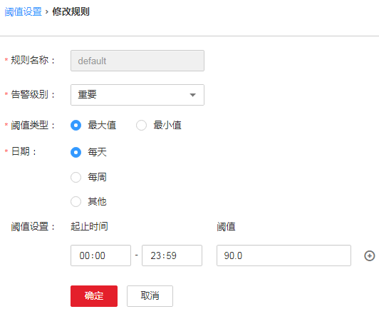 - 根据实际服务的使用情况在“运维 > 告警 > 阈值设置 > 待操作集群的名称 > 主机 > 磁盘 > 磁盘使用率”中更改告警阈值。如图1所示图1 设置告警阈值