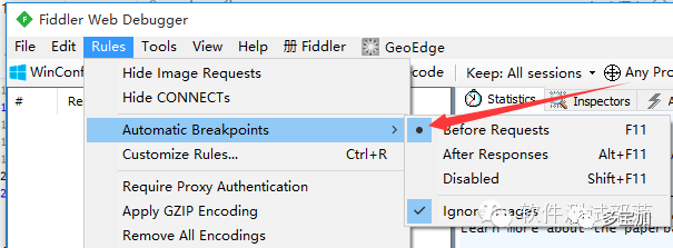 打开fiddler 点击rules-> automatic breakpoint ->before requests(这种方法会中断所有的会话)