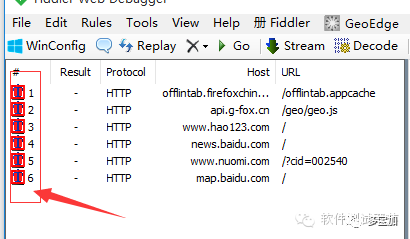 3.在fiddler会话框前面图标显示下箭头,如下图所示