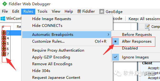 1.打开fiddler 点击rules-> automatic breakpoint ->after requests