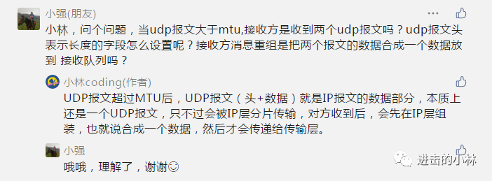 当用户消息通过 UDP 协议传输时,操作系统不会对消息进行拆分,在组装好 UDP 头部后就交给网络层来处理,所以发出去的 UDP 报文中的数据部分就是完整的用户消息,也就是每个 UDP 报文就是一个用户消息的边界,这样接收方在接收到 UDP 报文后,读一个 UDP 报文就能读取到完整的用户消息。