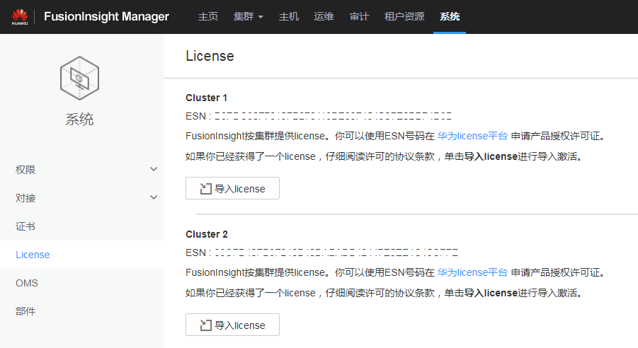 - 打开FusionInsight Manager页面,选择“系统 > License > 待操作集群的名称”。