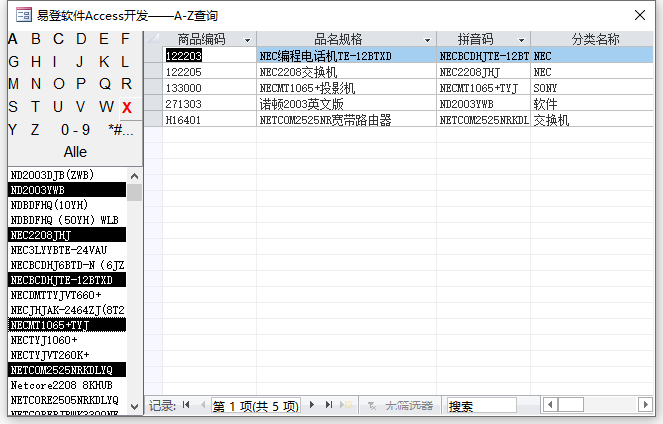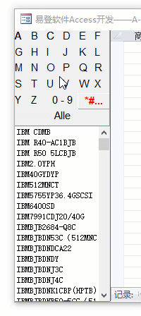 这个示例我们可以看到可以按字母A-Z,数字0-9的一个筛选编码,同时可以选择编号后可以显示对应的明细数据。