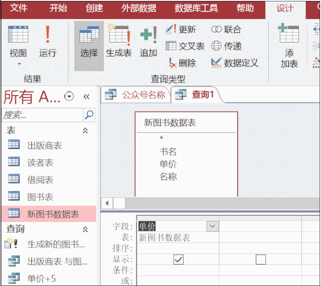 示例使用上节创建的新的图书表数据作为数据源,创建查询设计,添加表。选择需要更新的字段。