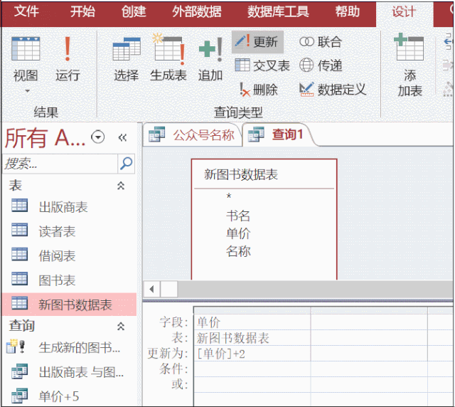 问题:由于运输费用增加,书的单价增加2元,通过更新查询修改新表中的单价。(下面依然套用创建查询设计的步骤来演示。)