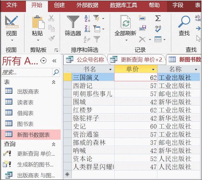 点击运行(点击一次)。运行保存的查询,可以点击新图书表中查看数据的变化。(如果更新查询在导航窗格中,建议先右键,选择设计视图,打开后再运行。避免多次运行,导致多次执行更新查询操作。)