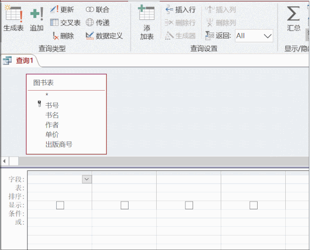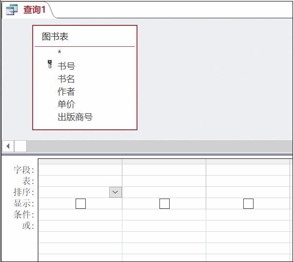 下面按照前面介绍的查询设计的步骤,确定数据源为"图书表"。创建“查询设计”,添加表“图书表”。