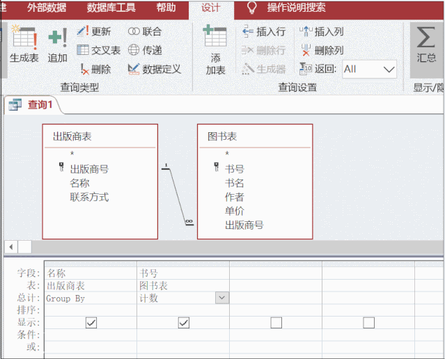 分析:需要的查询的数据分别来自出版商表和图书表。由于需要按不同的出版商来分组统计,所以出版商字段需要在使用“Group By”来分组,而书种类的数量则需要使用“计数”,而计数采用的字段则是选用图书表的主键“书号”(因为“书号”作为主键,是不能为空且不可重复的。)