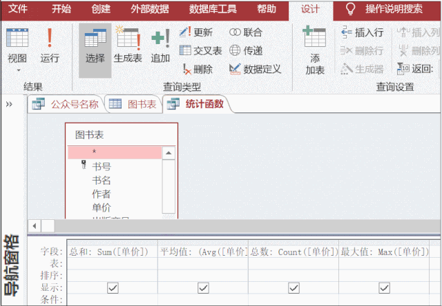 创建查询设计,添加图书表,添加单价字段,对单价字段,分别使用SUM([单价])来求和,AVG([单价])求单价, COUNT([单价])来计数, MAX([单价])求单价的最大值。单价由于是字段,输入完函数公示后会自动添加[ ]。然后分别改下名字,点击运行,得到查询结果。