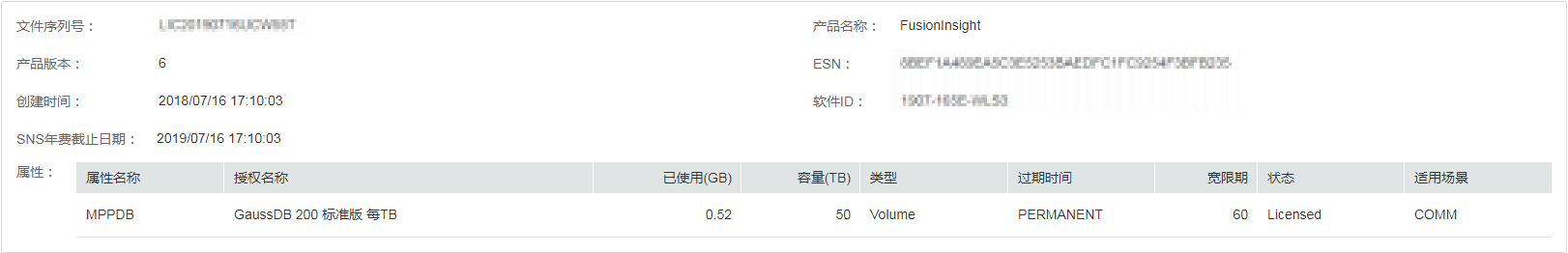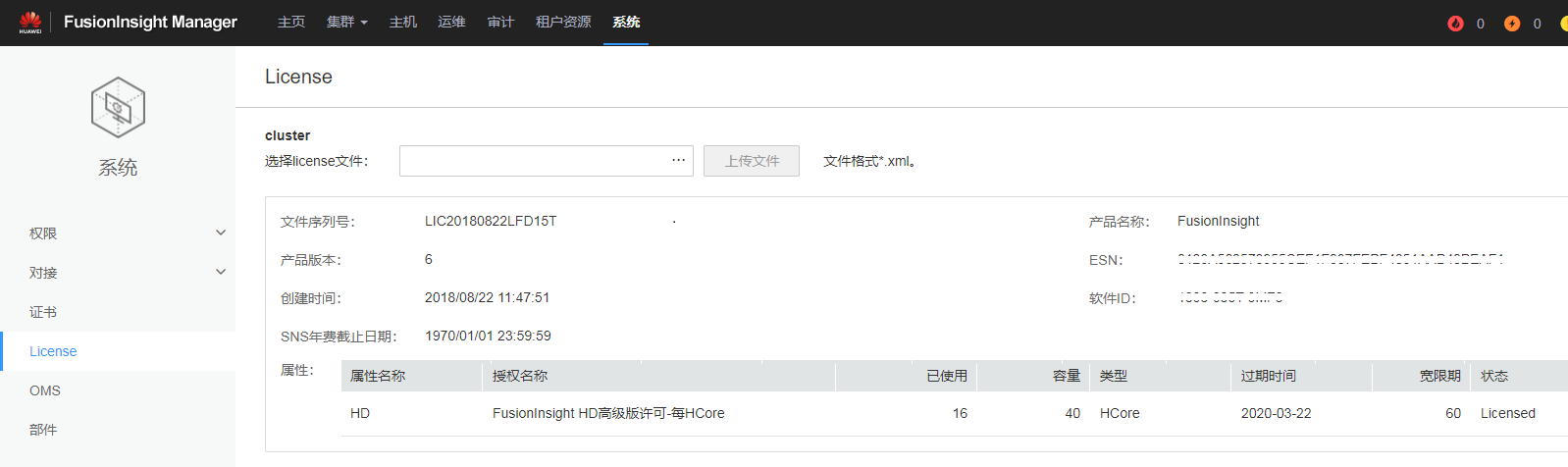 - 联系一线交付人员为系统License新增SnS年费授权,将该License导入FusionInsight Manager并激活,具体操作请参考相应产品对应版本的《License指南》。