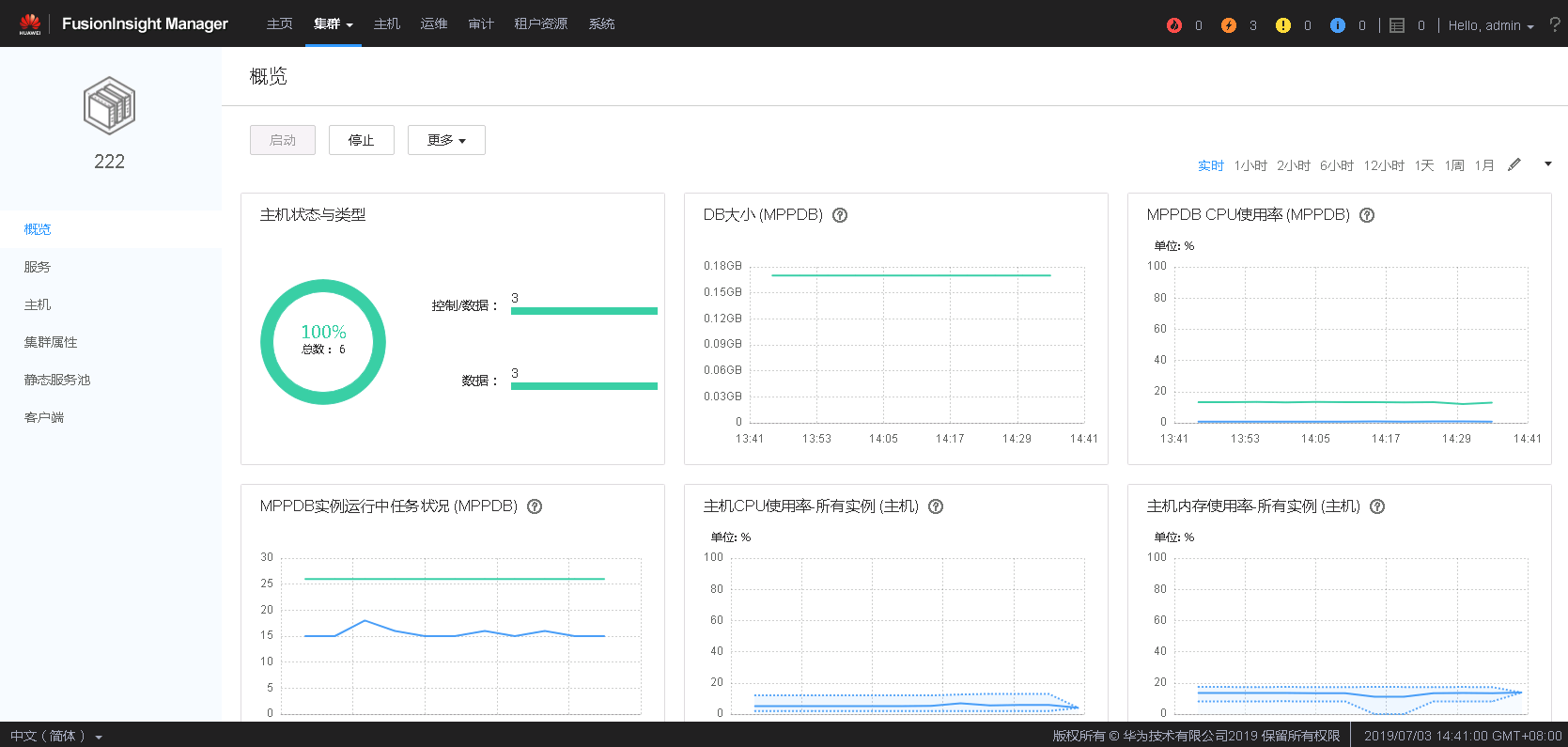登录FusionInsight Manager,选择“集群 > 待操作集群的名称 > 概览”可以查看当前集群的主要状态信息。
