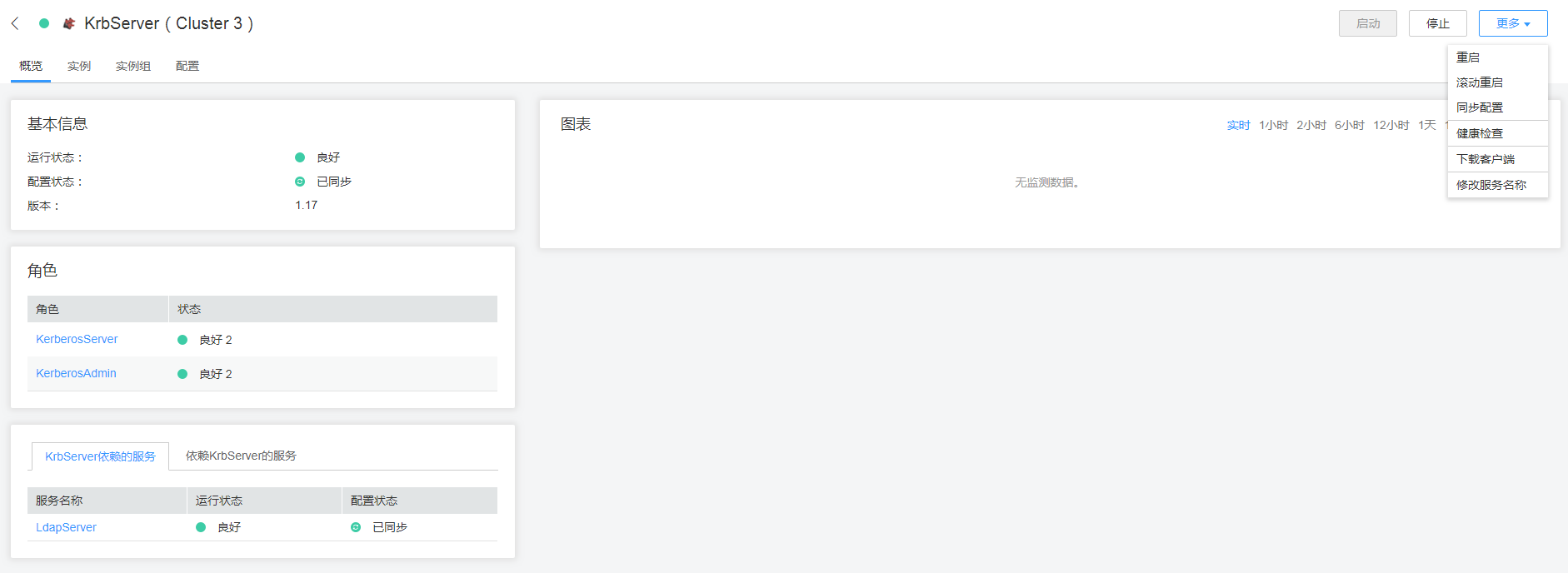 登录FusionInsight Manager以后,例如选择“集群 > 待操作集群的名称 > 服务 > KrbServer > 实例”,进入实例管理页面,包含功能区和角色实例列表。