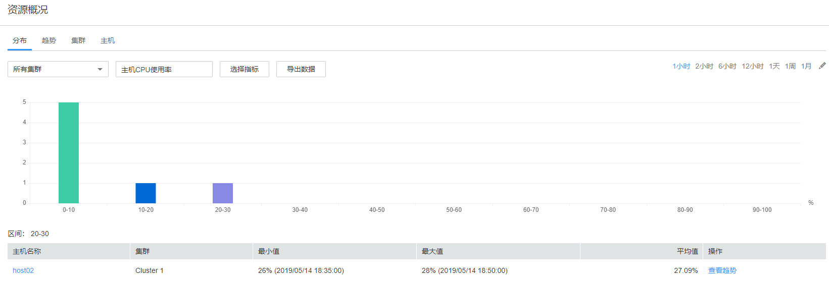 单击“主机 > 资源概况 > 分布”,可查看各集群的资源分布监控,如图1所示,默认显示1小时的监控数据。用户可单击