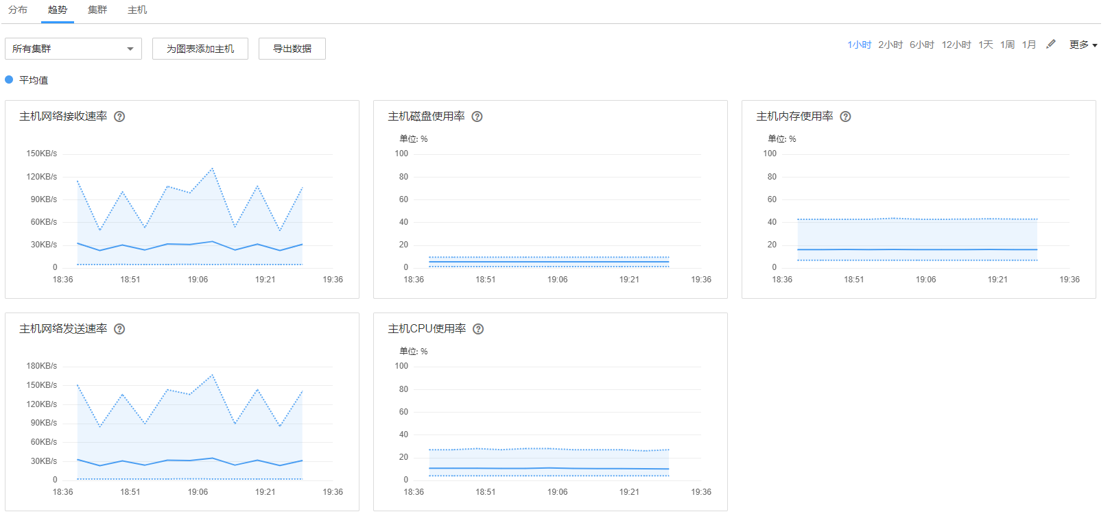 自定义时间区间,缺省时间区间包括:1小时、2小时、6小时、12小时、1天、1周、1月。各指标趋势图默认显示整个集群的最大值、最小值、平均值。