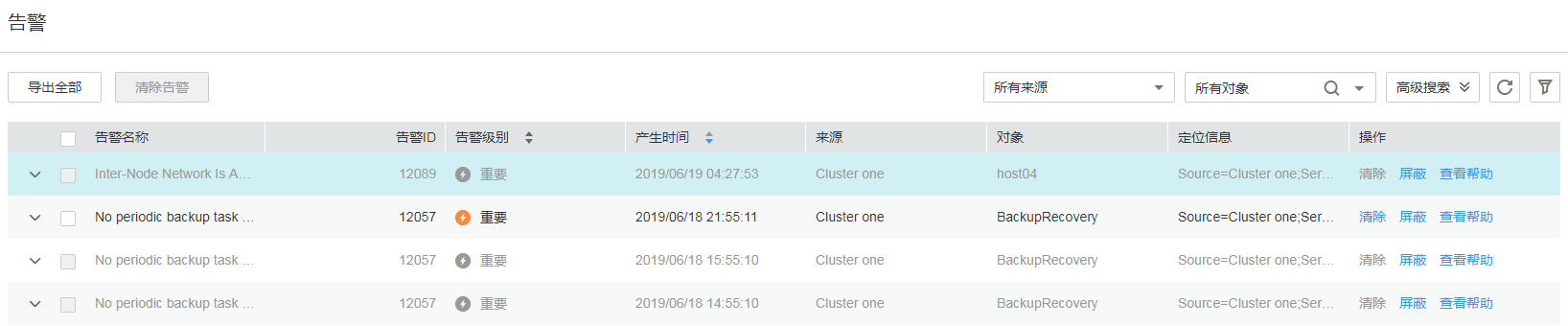 - 单个告警支持“清除”、“屏蔽”以及“查看帮助”操作。