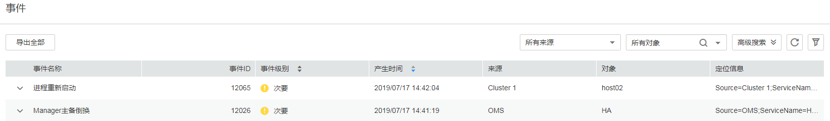登录FusionInsight Manager,选择“运维 > 告警 > 事件”,进入如图2所示的界面,用户可以查看集群中所有事件信息,包括名称、ID、级别、产生时间、集群、对象、定位信息,每页默认显示最近的十条事件。