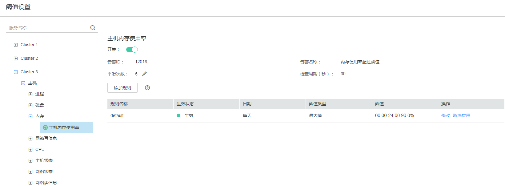 例如“主机内存使用率”,界面显示此阈值的信息:- 发送告警开关指示为