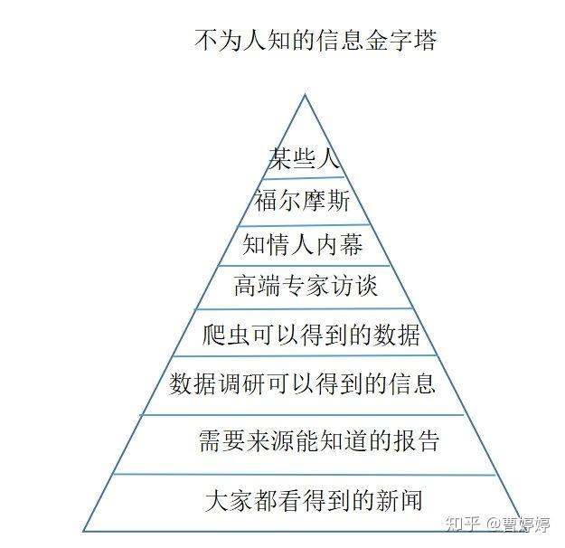但是 越往上走,越是接近信息更有价值,更新鲜,更真实有效,更直接,有大量的渠道 可以 获得更多 的信息,这些不仅是通过 行业报告获取的,还有包括自己可以控制的方法,包括爬虫,数据挖掘,信息技术 等,还包括人脉,圈子,内幕的等渠道。大家感兴趣可以到这个答案看下详情,我对每个层级的方法的解读。