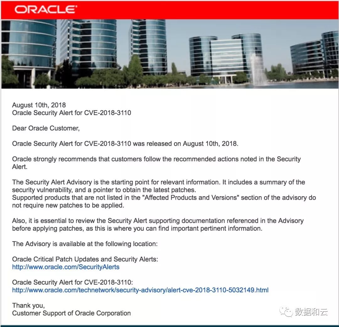 在 2018年8月10日,Oracle 独立的发送了一封"安全警告"邮件给所有的 Oracle 用户,这封邮件的标题是:Oracle Security Alert for CVE-2018-3110。这也是今年 Oracle 第一次独立针对一个 CVE 安全风险发布预警。