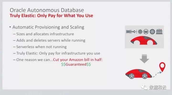 Larry 在整个演讲中,不知道说了多少次 AWS,基本上就是盯着 AWS 打。只会为使用到的基础架构资源付费,没用到的不用付钱。如果把数据库从 AWS 上迁移到 Oracle Cloud 上的自治数据库里,承担的成本将减半,特意重点标注了“Guaranteed”,Larry 拍着胸脯保证,账单数字一定会减半。