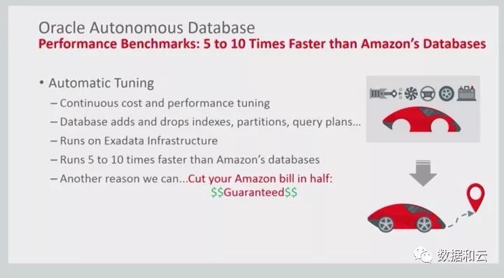Oracle 自治数据库,比AWS数据库快 5-10 倍。Larry,快 5-10 倍是什么意思?就是我用 10 秒钟干活的活儿,你 AWS 要干1分钟,在按照分钟计费的 Cloud 数据库中,这就意味着我比 AWS 要便宜 5-10 倍。