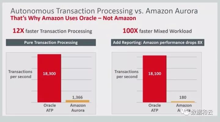 在纯的在线交易测试中,Oracle ATP 比 Aurora 快 12 倍,在混合负载场景下,Oracle ATP 比 Aurora 快 100 倍。在这一页上,Larry 疯狂嘲讽了 AWS,他说,AWS 让别人用 Aurora,用 Redshift,但是他们自己却在用Oracle,在 10年 前,AWS 就说要弃用 Oracle 数据库,但是到现在他们也没有做到。