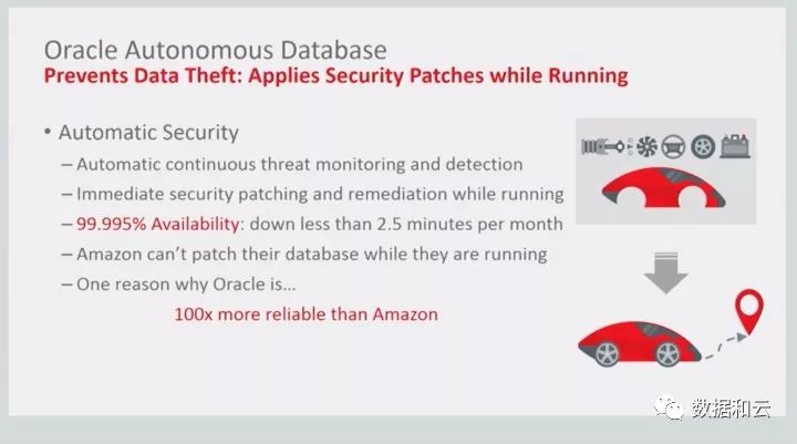Oracle 自治数据库可以在运行的同时实现安全补丁安装,可以让数据库获得 99.995% 的可用性,而 AWS 则做不到这一点,他们没办法在运行的时候为数据库打补丁。因此 Oracle 比 Amazon 稳定 100 倍。好吧,虽然我不知道这 100倍 的数字是怎么来的,但是 Larry 显得自信满满。