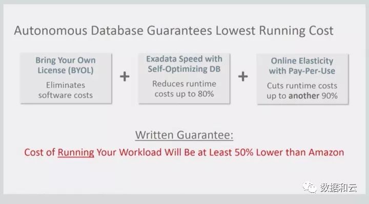 我们总说,Oracle 数据库除了贵没别的毛病,所以 Larry 在演讲快结尾的时候又再次提及了,这是我们写下来的承诺,能够满足客户业务负载的成本至少比 Amazon 便宜 50%。
