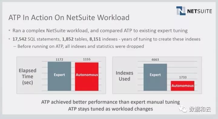 专家调优过的运行时间 1172 秒是运行了上面全部 17542 的 SQL 的总时长吗?但是,没关系,Oracle 想说的是,Oracle ATP 能够全自动地分析负载并创建更少更合适的索引,获得跟专家调优相近甚至更优的性能。