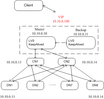 在集群启动后,客户端连接服务器时,首先会访问负载均衡服务器LVS,负载均衡服务器将连接按照一定的算法(如轮询算法)分发到各个数据库服务器上(CN)。由于负载均衡服务器的客户端访问数据库的入口,可能需要承担巨大的访问量,因此通过软件KeepAlived来实现LVS的主备切换,实现负载均衡的高可用方案。如不需要搭建主备方案,则直接搭建单机即可,单机的安装和配置与主备方案中主机完全相同。