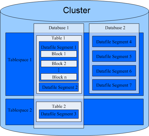 - Datafile Segment,即数据文件,通常每张表只对应一个数据文件。如果某张表的数据大于1GB,则会分为多个数据文件存储。