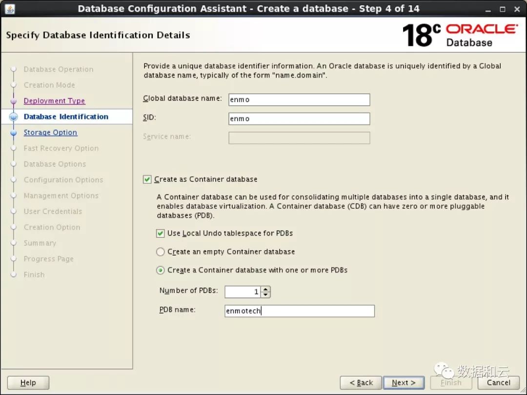 整个数据库的安装过程非常流畅,没有遇到任何问题,我选择创建了一个 SID 为 enmo ,包含一个 PDB ,PDB 的名称是 enmotech :
