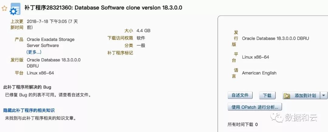整个补丁集合也就是我们今天公开下载到的,4.4 G 的补丁安装包,MOS 上的下载次数是 0 ,我贡献第一个下载: